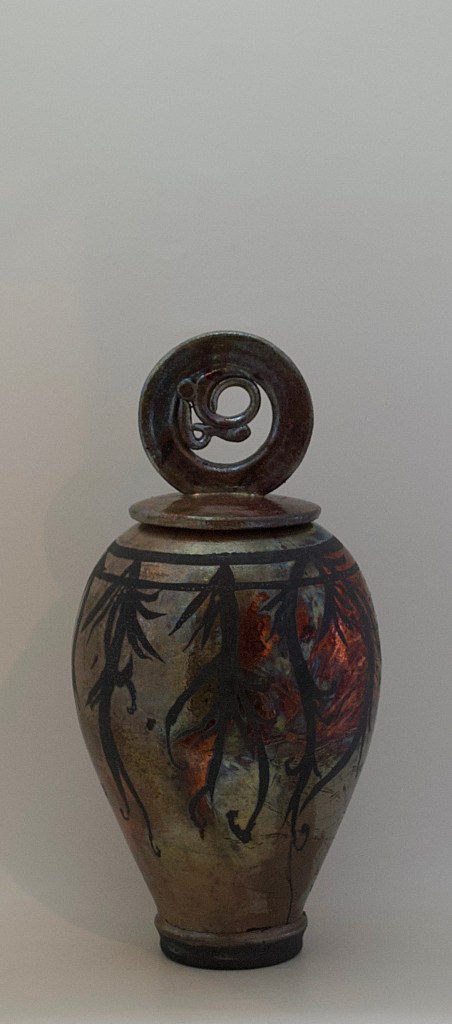Raku fired Lidded pot with ferric chloride. Not food safe